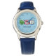 Un signe de paix, un coeur et un ruban d'autisme pour la sensibilisation sur l'autisme des gens du spectre. Une jolie montre pour enfants en bleu personnalisée avec le nom d'un enfant.