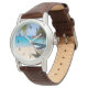 Une montre avec une scène de plage tropicale idyllique. Eau cristalline bleu turquoise et plage de sable brun doux. Des feuilles de palmiers accrochés au-dessus. Un vieux bateau à rames en bois est installé sur la plage. Un paysage serein et paisible.