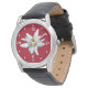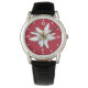 Belle montre à bracelet avec des graphiques d'une seule fleur alpine fleurie d'un Edelweiss, sur un arrière - plan rouge. Des points et des chiffres blancs ornent le bord extérieur du visage. Customisez d'ajouter le texte que vous voulez.