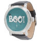 Boo! design de texte pour Halloween avec chat, araignée, hibou et araignée décoration sur arrière - plan bleu grunge.
