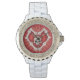 Cette montre à poignet a un coeur gothique rouge foncé qui est entouré d'os blancs et d'un crâne blanc au centre du coeur sur un arrière - plan rouge aux lignes en spirale blanche.
