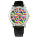 Cette montre a une conception Bauhaus d'un collage de triangles en rouge, jaune, orange, bleu et vert.