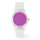 Une jolie montre à poignet rose, avec un motif lumineux de différents points rose et bleu sur un arrière - plan Magenta.