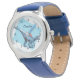 N'importe quel petit garçon adorerait cette montre qui présente un dinosaure bleu ! L'imaginaire dinosaure est placé sur la partie inférieure de la montre sur un arrière - plan à carreaux bleu clair bord déchiqueté. Son nom est écrit en bleu foncé au centre supérieur, et les chiffres bleus correspondants autour du bord rendent la montre facile à lire.