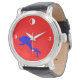 A red customizable color background with a blue scuba diver graphic design - never be late again