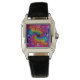 Montre à bracelet en cuir noir pour femmes avec une image de dragons fractaux colorés arc-en-ciel vibrants avec queues rose vif. Voir l'ensemble de la collection Fractal Art Watch dans la section ACCESSORIES.