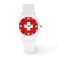 Vous n'aurez pas à vous soucier d'un rendez-vous avec cette montre design arborant le drapeau suisse lumineux et joyeux avec quelques edelweiss stylisés, l'une des nombreuses fleurs suisses de la région alpine. Que ce soit sur les pistes de ski ou en profitant d'une pause bien méritée avec l'un des délicieux plats nationaux suisses proposés dans les jolis chalets/restaurants suisses, cette montre attirera certainement des commentaires envieux!
