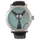 Montre Drôle mignon Chat Noir Art sur Blue Damask