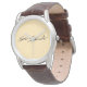 Montre classique en cuir Brown pour hommes avec signature Imaginez une montre qui témoigne du temps et reflète votre style. Voici la montre classique en cuir Brown pour hommes, ornée de ma signature et dotée d'un visage jaune pastel clair. Cette montre est conçue pour l'homme moderne qui apprécie le raffinement et l'élégance intemporelle. Pourquoi devriez-vous choisir cette montre ? Chaque homme mérite un garde-temps qui raconte non seulement le temps, mais aussi une histoire, votre histoire. Laissez cette montre faire partie de votre voyage, marquant chaque instant avec élégance et précision. Avec cette montre masculine classique, vous pouvez élever votre collection de vêtements de poignées, faire une impression durable et embrasser le mélange parfait de la mode et de la fonctionnalité.