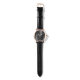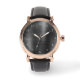 Élégante bracelet en cuir noir, montre pour hommes aux accents d'or rose, cadran en métal brossé et numéros blancs.