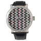 Cette montre masculine a un design moderne du milieu du siècle des ovales blancs avec des cercles rouges reliés par des lignes blanches sur un champ de noir. Vous voulez des couleurs différentes ? Message-moi.