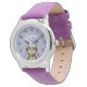 Cette jeune fille moderne et fillette montre une belle caricature en paresse peinte à la main avec une magnifique couronne de fleurs dans ses cheveux, sur un mignon arrière - plan violet. Cette montre à l'aquarelle fleurie en parfum dispose également d'un endroit où vous pouvez ajouter le nom de votre fille dans une typographie élégante. Le design faunique parfait pour la première montre d'un enfant !