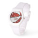 Cette montre de basketball sporty personnalisée présente un graphique de basketball simple qui a recoloré alternativement des panneaux rouges et blancs, sur lesquels vous pouvez facilement customiser le nom de l'athlète dans une police de style signature (ou autographe) au-dessus du numéro de maillot du joueur (dans une police de style lettre variée), et des chiffres de visage de l'horloge blanche - par katz_d_zynes
