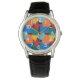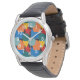 Cette montre pour hommes a un design Bauhaus de formes aléatoires en bleu, turquoise, jaune, rouge et orange.