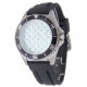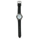 Front and back view of a sporty wristwatch. The front shows a metallic case with a black bezel and a patterned blue dial. Black rubber strap.