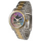 Keeping Time Drummer et Music Notes Watch. Un batteur joue un tambour placé sur un arc-en-ciel de notes musicales psychédéliques avec des chiffres en or métallique clair et les mots "garder le temps". A Music Watch pour votre musicien percussionniste préféré ou amoureux de la musique.
