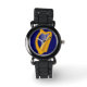 Montre souvenir irlandaise ornée d'un motif de harpe irlandais doré, contre un arrière - plan bleu foncé.
