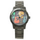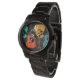 Wristwatch pour un joueur de guitare avec une place pour sa première. Arrière - plan de bois foncé avec des guitares de vert, orange, jaune et bleu sur le visage. Inclure une initiale de prénom dans le modèle en haut. Cette montre masculine est le choix idéal pour tout musicien ou amateur de musique. La bande et le style peuvent être changés, avec une grande sélection à choisir.