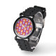 Cette magnifique montre est dotée d'un mignon petit fantôme blanc aux yeux noirs et d'une bouche noire large ouverte. Chaque fantôme est posé sur un carré orange ou un carré violet et chaque carré contient du texte orange ou violet qui dit Boo ! Le résultat est un motif de carrés et de fantômes.