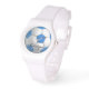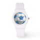 Montre de football bleu et blanc pour une joueuse de football, avec une place pour son nom en script noir. C'est le cadeau personnalisé parfait pour une jeune fille ou un ado. La couleur de bande peut être changée de rose en rouge ou blanc, ou changer complètement l'apparence de la montre.