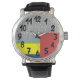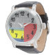Cette montre pour hommes a un design de lignes noires cassées courant verticalement en rectangles de bleu clair, vert, bleu, jaune et rouge. Vous voulez des couleurs différentes ? Message-moi.