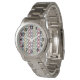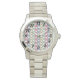 Cette montre pour femmes a un design moderne du milieu du siècle de cercles blancs "déformés" reliés à des lignes noires sur un champ de bandes vert pâle, rose pâle, bleu pâle et jaune pâle. Si vous aimez le design mais préférez différentes couleurs, envoyez-moi un message.