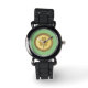 Cette superbe montre présente une image graphique d'une pièce d'or avec deux nuances d'or. Le cercle extérieur a une texture rugueuse. À l'intérieur du cercle intérieur de la pièce se trouve un shamrock doré texturé composé de 3 feuilles et d'une tige.