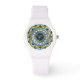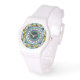 Cette montre sportive a une lunette et une sangle blanches et est magnifiquement décorée avec un tableau numérique original de Leslie Sigal Javorek inspiré par les magnifiques bijoux & mendhi (tatouages au henné) modèles indiens. Dans les tons bleu, turquoise, violet, perle et or.