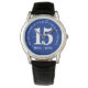 Reconnaissez les contributions inestimables des employés avec cette montre commémorative de 15 ans de service au poignet, qui présente des lettres de bloc élégantes sur un arrière - plan en marbre bleu royal. Personnaliser avec message et années de service. Note : Le design est optimisé pour les montres rondes. Conception et copie © W.H. Sim. Tous droits réservés. Voir plus sur zazzle.com/expressionsoccasions