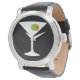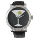 Cette Montre Martini Movie Classique présente un arrière - plan noir et l'image d'une silhouette blanche d'un verre martini. A l'intérieur du verre se trouve une glorieuse olive verte avec un pimento orange. C'est une montre-bracelet amusante pour tous ceux qui souhaitent être un personnage dans un film classique. Réveille pas, s'il te plaît !