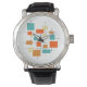 Cette montre aux lignes et carrés géométriques turquoise, orange, crème et noir rétro du milieu du siècle ajoutera non seulement une pop de couleur à votre bras, mais sera aussi une oeuvre d'art originale.
