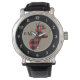 Voici une montre amusante et branchée qui est aussi attrayante ! Au centre se trouve une tête de cerf de buck en silhouette de buffle rouge et noir. À côté de l'image du cerf se trouve votre monogramme de trois lettres en noir. L'image est placée sur un arrière - plan clair, qui est entouré d'un cercle noir avec des chiffres blancs, ce qui rend la montre facile à lire.