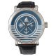 Design à thème nautique avec symboles nautiques (ancre, voilier, voilier, boussole) décoration sur arrière - plan rayé blanc et bleu marine.