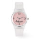 Une montre sportive avec bracelet en silicone transparent durable et face en faux parties scintillant rose pâle. Le nom est une police de script noir en gras. Modifiez facilement le nom, remplacez par des initiales monographiques ou retirez-le pour le rendre vôtre en utilisant le Modèle fourni. Choisissez parmi d'autres styles et couleurs.