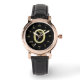 Cette montre à la mode comporte un visage et des mains noirs, des chiffres romains de couleur or et une lettre O de couleur or. Grande pour un individu avec le O initial.
