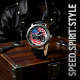 This watch face prominently features a dark-colored cruiser motorcycle against a vibrant, waving American flag background. The motorcycle has subtle blue accents, matching the flag's colors. The design captures a sense of freedom and patriotism, with clear white watch hands and numbers for easy time reading.