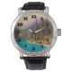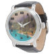 Une montre avec une photo pittoresque de paysage du nord comme toile de fond. Un lac aux couleurs turquoise avec une forêt de pins en arrière - plan et un ciel brumeux lui donnant une qualité mystique magique.