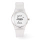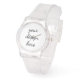 Style : Montre en Silicon rose féminin Le cadeau parfait pour les filles sportives que vous aimez, cette montre de sport classique est un accessoire idéal pour toute activité. Bracelet en silicone solide et confortable, ajoutez vos texte et photos sur le cadran personnalisable pour créer une montre a votre image. Montre au poignet pour femmes Matériel : Bracelet : Coque en silicone Dimensions : Face : 1,18" de diamètre Bracelet : 9,5" x 0,79" de Coque : 1,57" de diamètre Poids : 0,082 lb analogique à 3 mains Japan Quartz® Impression personnalisée en couleur sur le visage Disponible en 2 couleurs - Boîtier blanc et rose 1 an fabricants garantie limitée Batterie incluse Ce produit est recommandé pour les 13 ans et plus