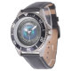 Une montre avec une image de lentille de caméra dans un style bleu avec des marques d'heure sur l'objectif. Un cadeau parfait pour un photographe professionnel ou amateur. Une petite balise d'id subtile pour ajouter des initiales ou du texte.