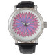 A watch with a pink and pale blue flower design on the face features a Aztec-inspired aesthetic, with a white background to highlight the bold, abstract flower design.