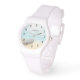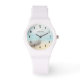 Une montre avec une belle image rustique. Couleurs subtiles de bleu clair, marron sablonneux et blanc doux. Une scène de plage avec un bateau sur le rivage avec un filet de pêche accroché à côté. Un élégant look défraîchi.