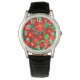 Cette montre pour hommes a un design de Noël de poinsettias éparpillé sur un champ de rayures vertes.