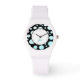 Personnalisez cette montre à pois de style rétro moderne et amusante avec un Nom ou votre propre texte dans la bordure circulaire de cercles bleu turquoise et blanc dégradé sur le noir. Cette image est une photographie originale de JLW_PHOTOGRAPHY.
