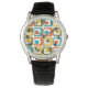 Cette montre pour hommes a un design moderne du milieu du siècle de quatre rectangles arrondis en quatre rangées avec ovales à l'intérieur en orange, jaune, vert et turquoise.