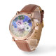 Elégante montre florale, bleu, roses blanches roses et anémones sur arrière - plan gris avec pierres précieuses imprimées rose.