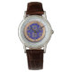 Cette belle montre est élégamment décorée d'un subtil motif géométrique en bois sculpté et gaufré dans un cercle central. L'arrière - plan du cercle en bleu royal renforce la très belle dentelle et est entouré d'une couronne de bois. Vous pouvez customiser une impression très délicate de vos initiales écrites dans une police de caractères bleu raffinée au bas de la couronne. Un subtil jeu d'ombre/lumière donne l'illusion que la pièce centrale de cette montre est en relief. L'arrière - plan principal reste blanc et affiche de minces petites marques bleues pour les numéros d'heure.
