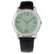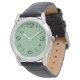Cette montre pour hommes a un design art déco de demi-cercles bleus et violets se connectent avec des lignes sur un champ de vert clair.