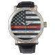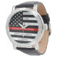 Célébrez et montrez votre reconnaissance à un pompier exceptionnel avec cette Mince ligne rouge retraite ou Anniversaire Firefighter Watch - Drapeau américain dans Firefighter couleurs dans un design moderne noir et rouge. Parfait pour les prix de service incendie et les cadeaux de retraite de pompier et de retraite de pompier. Personnalisez cette montre de retraite des pompiers avec le nom et, années de service et années de service, service des incendies. DROIT D'AUTEUR © 2020 Judy Burrows, Black Dog Art - Tous droits réservés. Service d'incendie de pompier sur mesure Surveillance de retraite des pompiers