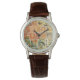 Une montre classique à bracelet brun avec des oeuvres d'art reproduites à partir d'un collage original composé de timbres-poste vintages dans les tons orange du coucher du soleil et vert mousse. Les timbres-poste présentés datent d'un large éventail de périodes, du début du dernier siècle jusqu'aux années 1970 (ou alentours). Ils portent encore des fragments de postmarks et d'autres marques d'annulation comme témoignage de leur ancien service actif pour les services postaux mondiaux, fournissant un vrai sens de l'histoire. Oeuvre créée par Su Mwamba de TangleCrafts en 2015.