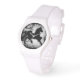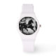 Une silhouette de cheval noir et blanc est présentée sur cette montre élégante au poignet. Parfait pour les amateurs de chevaux.